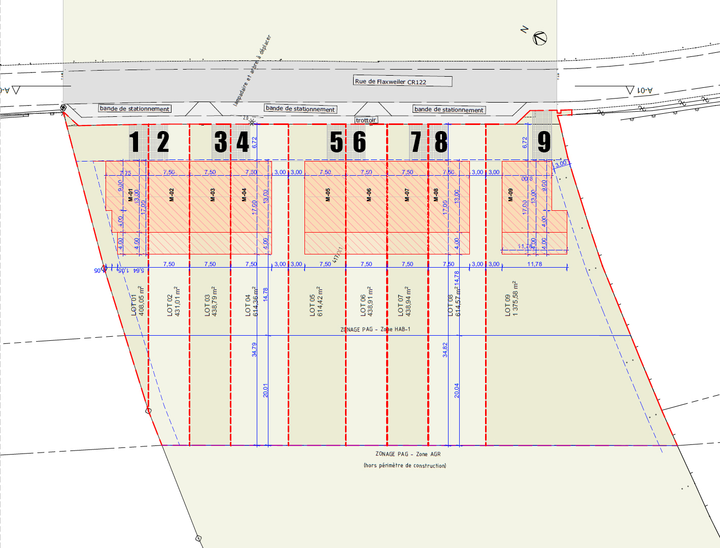 Le projet « Auf Pohfeleck » concerne exclusivement la vente de terrains à bâtir – sans contrat de construction. L’acquéreur reste totalement libre dans le choix de son entreprise de construction. Toutefois, les plans sont vendus avec les terrains. Le projet prévoit la construction de 9 maisons unifamiliales, dont une maison individuelle indépendante.
